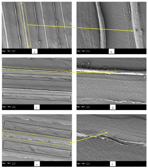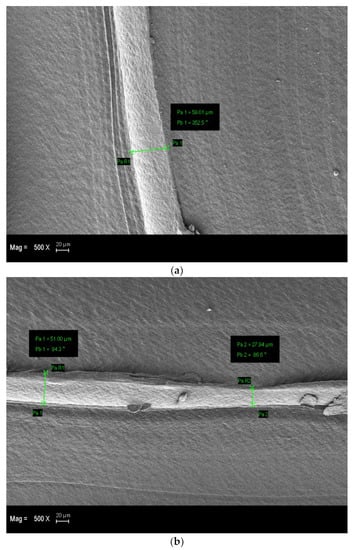 SEM micrographs of non-cured (a, b), 30 min post-UV-cured (c, d), and 60 min post-UV-cured (e, f) samples produced at 190 °C are given in Figure 8. Printing lines are indicated with yellow frames, and surface deformations are indicated with black frames on the SEM micrographs. Accordingly, the printing lines, which are distinctly prominent and regular in the non-cured samples (Figure 8a,b) and samples exposed to UV irradiation for 30 min (Figure 8c,d), turn into discontinuous, irregular, non-uniform, and less obvious printing lines on the PLA micrograph exposed to UV light for 60 min (Figure 8e,f). In addition, the measured diameters of printing fibres of (a) non-cured and (b) 30 min post-UV-cured samples in the SEM micrographs are given in Figure 9. Accordingly, the diameter of the printing fibres on the non-cured specimen’s outer surface is larger than that of the specimens that were post-UV cured for 30 min. The post-UV curing process reduces the prominence of the fibres on the sample surface and causes their diameter to decrease. This may be due to the fact that the post-UV curing process causes the rearrangement of molecular chains on the material surface to be tighter and the distance between molecular chains shortened [,]. Correspondingly, the reason why A3 and B3 samples have the highest flexural strength values in the A and B series samples may be that the UV-irradiation process forms a stronger adhesion combination between the printing fibres and reduces the number of air gaps on the surface and in the internal structure of the PLA specimens []. Surface degradations that are not encountered in the non-cured samples but that occur in the samples exposed to UV irradiation for 30 and 60 min are also clearly visible, and it has been noticed that the surface area of these craters increases with the increase in the UV-irradiation time. The decrease in flexural strength values after 30 min with the increase in the UV-irradiation exposure time may have resulted from the increase in the area of the deformation zones and surface irregularities on the material surface, as can be seen in Figure 8. The surface degradation and irregularities seen in the PLA samples, especially after more than 30 min of post-UV curing, may be due to the ageing phenomenon of the post-UV curing process. As a result, the relatively unequal bond strength between the surface fibres of PLA has occurred, and the bonding success between printing fibres has decreased. The fact that PLA has a biodegradable structure, the ageing phenomenon triggers this process, causing the material to begin degrading. The degradation of the material by such an accelerated effect may be due to the active material degradation mechanism and the occurrence of chain breaks [,,].