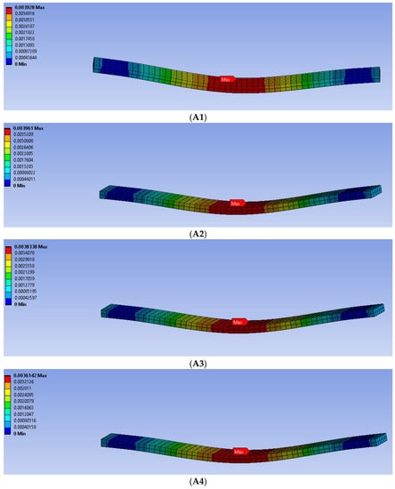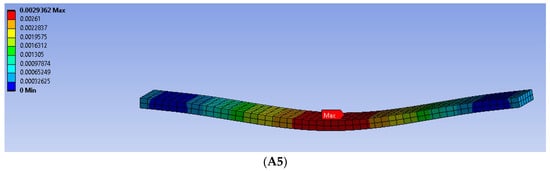 The deflection results of the specimens subjected to a three-point bending test were obtained with the FEA. Figure 10 shows contour graphs of displacement results obtained with ANSYS Workbench. The experimental results were compared with the FEA results attained using ANSYS Workbench. The average error in deflection () was calculated as follows: