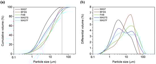 (a) Cumulative percentage volumes and (b) grain-size distributions of raw materials (MA57, BFSS and FAB) and binary blends (MA57S and MA57F).