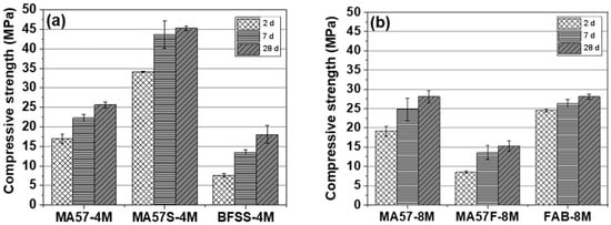 Compressive strength of samples tested at different stages: (a) 4 M NaOH activated pastes; (b) 8 M NaOH activated pastes. The mean values of six tests for each sample are reported. The standard deviations are represented by vertical bars.