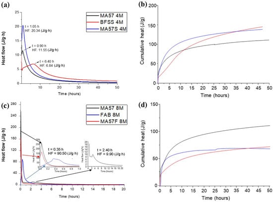 Figure 3a,b shows the heat flow and cumulative heat from the activation of MA57, BFSS and MA57S with the 4 M NaOH solution. The only peaks detected in the heat flow curves were related to the acceleration/deceleration steps, associated with the reaction products precipitation []. MA57_4M and MA57S_4M exhibited a faster reaction time (peaks at t = 0.90 h and t = 1.05 h, respectively) compared to BFSS activated sample (peak at t = 6.4 h, in agreement with [] for alkali activated slags). The cumulative heat released by all systems (Figure 3b) grew exponentially with time. The highest total heat was detected in BFSS_4M, probably associated with a greater amount of reaction products or the formation of more exothermic reaction products.