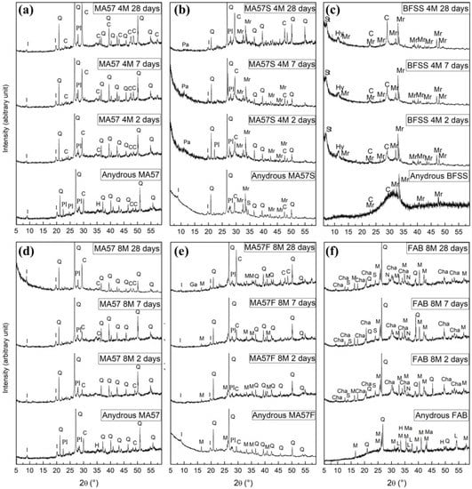 In Figure 4a–f, the XRPD patterns of precursors (in the bottom part of each panel) and alkali-activated samples tested at different stages are shown.