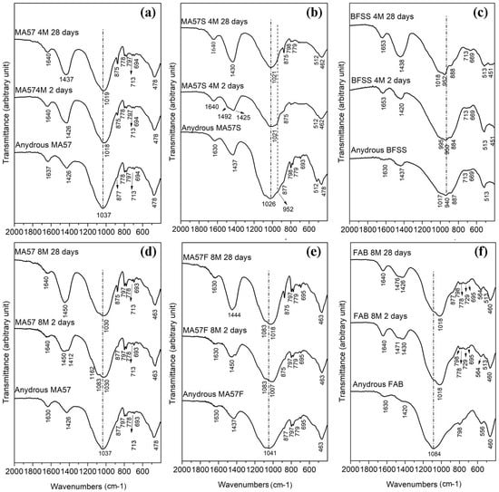The FTIR spectra of MA57F_8M (Figure 5e) exhibited wide bands that seemed to be composed of two different peaks: the former, falling at 1083 cm−1, was associated with T-O (T = Si, Al) vibrations of non-reacted phases (mainly quartz) [,], the latter, falling between 1005 cm−1 and at 1020 cm−1, was attributed to the asymmetric stretching vibrations generated by the Si-O-T bonds (where T is Si or Al) and associated with the precipitation of a geopolymeric gel []. Bands related to carbonation products were detected at 1444–1450 cm−1 and 875 cm−1.