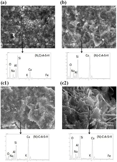 The presence of calcium in raw materials and its role on the characteristics of AABs, are matters of consistent interest [,,,,,,]. At the same time, the compatibility of the gels ((N,C)-AS-H and C-A-S-H) in hybrid systems producing the so-called hybrid alkaline cements, is the object of different studies [,].