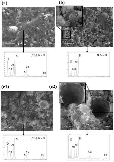 SEM images depicting the micro-morphological features of the different pastes at 28 days are shown in Figure 6 and Figure 7. A cementitious matrix consisting of (N,C)-A-S-H/N-(C)-A-S-H gels, related to the presence of calcium in the precursors [,,], was identified in all samples.