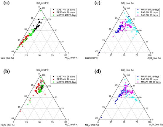 EDS analysis of precipitated gels at 28 days graphed on (a,c) CaO-Al2O3-SiO2 and (b,d) Na2O-Al2O3-SiO2 ternary diagrams.