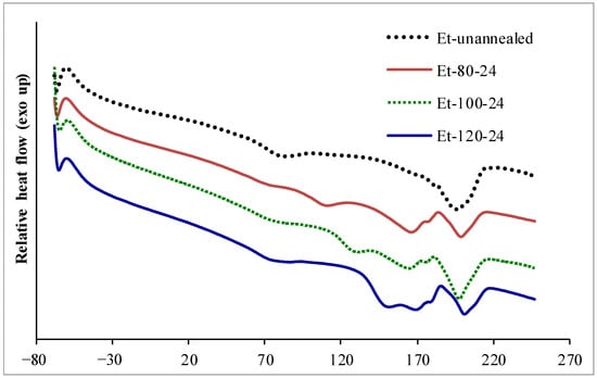 For the unannealed PU-Ether nanocomposites in Table 1, Tg(MP) at 74 °C, TMM(H) at 196 °C and ΔHMM at 14.9 J·g−1 were found. Unfilled PU-Ether showed Tg(MP) at 70 °C and TMM at 162 °C and two microphase mixing peaks: TMM(L) at 174 °C and TMM(H) at 183 °C with ΔHMM of 15.1 J·g−1. The annealing also introduced microphase separation with regard to Tg(MP), which decreased by 6 to 12 °C. For PU-Ether nanocomposites, annealed at 80 and 100 °C, Tg(HP) were found to have increased by 20 °C with increasing annealing temperature. At an annealing temperature of 120 °C, Tg(HP) was not found, but TMM(L)A was observed and increased with annealing time. These results revealed that hard segments in PU-Ether were able to move and align in amorphous form at annealing of 80 to 100 °C. The orientation of the ordered structure in crystalline form was introduced at 120 °C. Comparing the PU-Ester and PU-Ether nanocomposites, it was found that the crystallization of segregated PU-Ether hard segments occurred at higher annealing temperatures. It is possible that PU-Ether nanocomposites had a higher microphase mixing temperature and higher melt viscosity.