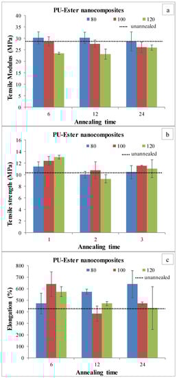 Tensile testing of annealed PU-Ester/MWCNT nanocomposites; tensile modulus (a), tensile strength (b) and elongation at break (c).
