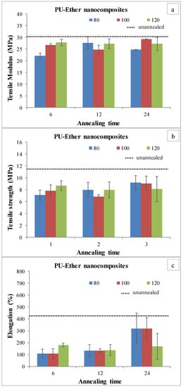 Tensile testing of annealed PU-Ether/MWCNT nanocomposites; tensile modulus (a), tensile strength (b) and elongation at break (c).