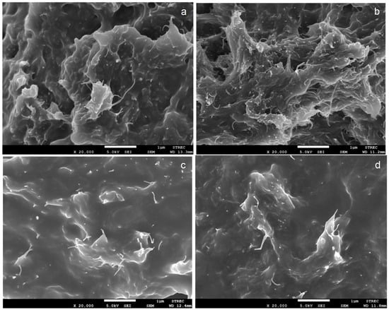 The fracture surfaces of the tensile-testing specimens were characterized by FESEM to investigate MWCNT dispersion after annealing. FESEM images of PU nanocomposites, unannealed and annealed at 80 to 120 °C for six hours, are shown in Figure 5 and Figure 6. The fracture surfaces of all nanocomposites were rough. This implies that the annealing process did not affect the toughness of PU nanocomposites based on different soft segments. MWCNTs were able to disperse in PU matrices with good distribution and dispersion. It was found that the annealing temperature and time did not affect the agglomeration of MWCNTs in either PU-Ester (Figure 5) or PU-Ether matrices (Figure 6). Nanocomposites of PU, based on different soft-segment structures, showed similar behaviors. Moreover, no significant difference in MWCNT dispersion was observed between unannealed and annealed nanocomposites. Thermal treatment could affect the movement of polymer chains, resulting in the development of amorphous and crystalline parts. However, MWCNTs were still well dispersed in segmented PU with increasing annealing temperatures.