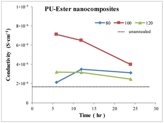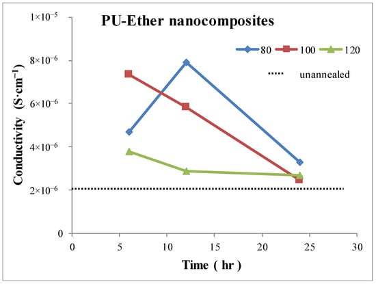 The volume conductivities of nanocomposites were determined. Measurements were performed in the frequency range of 20–1 × 106 Hz in order to detect the frequency range in which the conductivities of all the MWCNT nanocomposites remained constant. These persistent conductivities at the lowest frequency were collected and subsequently analyzed so as to gain an understanding of the effect of the annealing process. After determining the conductivity values using a variety of frequencies, conductivities of 200 Hz were used for all the nanocomposites. The conductivities of PU-Ester and PU-Ether nanocomposites are shown in Figure 7 and Figure 8, respectively. The conductivity of unannealed PU-Ester nanocomposites was found to be 1.76 × 10−6 S·cm−1 and that of unannealed PU-Ether nanocomposites was 2.14 × 10−6 S·cm−1. After heat treatment under different conditions, all the annealed nanocomposites demonstrated an improvement in conductivity. Conductivity decreased with longer annealing time, excluding at the annealing temperature of 80 °C. Similar results were found for nanocomposites of PU based on different soft-segment structures.