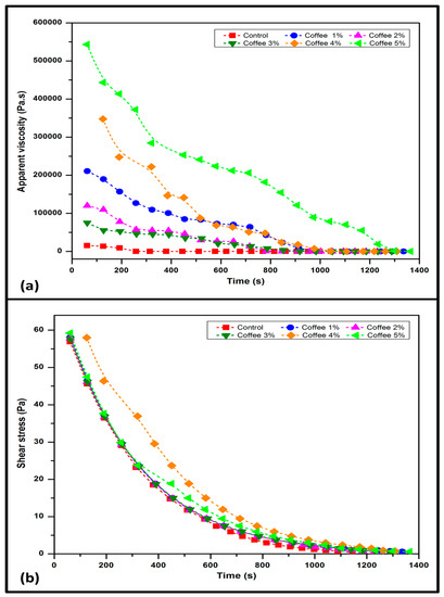 Figure 2. (a) The relation between time of shearing and apparent viscosity for seaweed/coffee film solution. (b) Effect of shear stress on time of seaweed/coffee film solution at different coffee loadings.