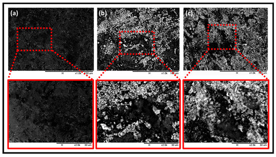 The surface morphology of the neat film and the seaweed/coffee-reinforced film at different concentrations of coffee filler are illustrated in Figure 3a–c. According to the figure, there was a slight difference in the morphology of the control (0 wt% coffee) and modified (1 and 5 wt% coffee) films in terms of the surface appearance of the films. The successful immobilization of the coffee particles on the seaweed biopolymer film was confirmed by SEM images. At 0 wt% coffee (control), it showed a relatively smooth surface of seaweed film. However, after the addition of coffee particles in the seaweed solution, it was found that the coffee particles appeared on the film’s surface. At high coffee loadings, more coffee particles are distributed around the surface of the film. However, the non-uniformity of dispersion of coffee waste particles was observed as the coffee concentration in the seaweed film increased from 1 to 5 wt%. This could be because the coffee particles were not well dispersed in the solution during the film’s preparation. The addition of coffee filler to the polymer matrix would significantly improve the mechanical properties of the films by reducing the porosity of the biopolymer film [23]. Aside from that, the interaction of strong intermolecular hydrogen bonding with numerous hydroxyl groups from seaweed and coffee, which have good miscibility with each other [6,24], was responsible for this enhancement. Filler agglomeration caused poor dispersion and distribution of coffee filler across the film, preventing the formation of a homogeneous mixture and lowering film performance [25]. Coffee agglomeration is important in determining the properties of biopolymer films. Because coffee has a strong tendency to agglomerate, incorporating only a small percentage of coffee is an alternative solution. Furthermore, combining low percentages of coffee loading can result in excellent dispersion and distribution. Coffee has a large interfacial area per unit volume due to its high specific surface area, which increases coffee–matrix interaction and aids in stress transfer between the coffee and the matrix. The mechanical properties of film will improve as a result of this achievement. A small amount of coffee will help to reduce the possibility of agglomeration in the polymer matrix [26]. As a result, incorporating a small percentage of coffee is an alternative solution to the problem.