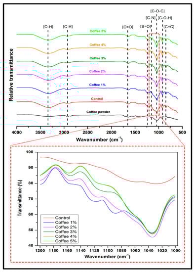 The structural changes and the intermolecular interactions of the neat film, the seaweed/coffee film and coffee powder were obtained from the FT-IR spectra as demonstrated in Figure 4. The characteristic peaks of coffee waste powder and seaweed biopolymer film at various coffee loadings were determined by FT-IR analysis at wavenumbers 4000 to 500 cm−1. Coffee waste exhibited bands typical of lignocellulosic materials, as its major constituents are hemicellulose, cellulose, lignin, and other small molecules [27]. The broad band maximizing at 3332 cm−1 in the spectrum was related to the O-H stretching and bending vibration, which was attributed to the presence of O-H moieties in the lignocellulose of the coffee material and seaweed polysaccharides [20]. Broad and wide peaks were also observed at 3329 cm−1 for all films containing seaweed, which were attributed to the stretching vibration of hydroxyl (−OH) groups caused by hydrogen bond formation. The intensity and width of the overall O-H band increased significantly as the coffee was incorporated into the seaweed film. This could be due to an increase in hydrogen bonding between the seaweed and the coffee [28].