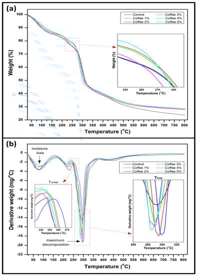 Figure 6. (a) Thermogravimetric (TGA) and (b) derivative thermogravimetric (DTG) curves of seaweed/coffee biopolymer film at different coffee loadings.