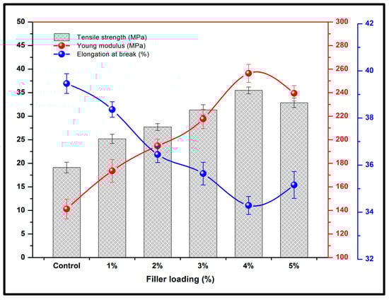 The tensile test was conducted, and the variation in tensile strength, elongation at break and tensile modulus are illustrated in Figure 7. The biopolymer films indicated increased tensile strength as the incorporated coffee increased. The films exhibited optimum tensile strength (35.47 MPa) as the film was enhanced with the addition of 4 wt% concentration coffee powder. The improved tensile strength was attributed to the good coffee dispersion in the seaweed matrix. The increase in tensile strength indicates that the coffee reinforcement was well dispersed within the polymer matrix, which influenced the adhesive interaction of the coffee reinforcement in the seaweed matrices [38]. The increase in tensile properties was primarily due to coffee’s high surface area, which provided good interfacial bonding between the polymer matrix, resulting in better stress transmission and elastic deformation [39]. Although the tensile strength was reduced after further increases in coffee powder in the matrix network, it was suggested that beyond 3 wt% coffee exhibited decreases in the tensile value (32.84 MPa). This may be attributed to the lack of interfacial adhesion between the coffee filler and the seaweed biopolymer matrix [30]. Interfacial adhesion occurs when two different materials are combined, blended, or mixed. This combination may create a better dispersion of materials into the matrices. Usually, to achieve better interfacial adhesion, the combination of materials must have the same properties, such as hydrophilic fillers and hydrophilic matrices or hydrophobic and hydrophobic materials, which create a strong bond between both materials. As hydrophobic fillers and hydrophobic matrices combine, better dimensional stability can be achieved, but when hydrophilic matrices and hydrophilic fillers or hydrophilic matrices and hydrophobic materials are combined, this may create a problem in the dimensional stability of the composites that are produced [40]. Generally, the wettability increases as the interfacial adhesion increases. However, at the highest 5 wt% coffee, the wettability of the film decreases. As mentioned earlier in the wettability study, the coffee waste material has hydrophobic properties [41]. This might be one of the reasons why the wettability decreased at the highest loading of coffee particles.