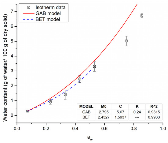 - Lewicki, P.P. The applicability of the GAB model to food water sorption isotherms. Int. J. Food Sci. Tech. 1997, 32, 553–557. [Google Scholar] [CrossRef]