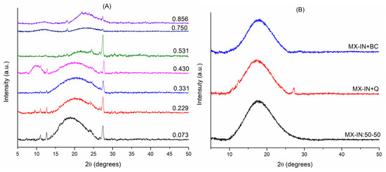 XRD diffractograms: (A) functional food blend MX-IN:25-75 at the different aw; and (B) blank samples.