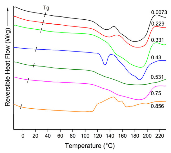 From the MDSC measurements, the glass transition temperature (Tg) of blend MX-IN:25-75 was determined after storage at different humidity conditions. Figure 5 shows the reversible heat curves at each aw. The determination of the Tg was performed graphically by identifying the onset of the reversible heat flow curve. The summary of Tg values is reported in Table 1. It is observed that the Tg tends to decrease with the increase of aw, and the variation of the Tg was in the range of 32.53 to −3.05 °C. This is a common behavior in sugar-rich systems, where the adsorbed water molecules act as plasticizers, decreasing the temperature to the point where the amorphous solid passes from a glassy to a rubbery state. Thus, it is preferable to keep the functional food in its glassy state because the microstructure of the solid remains rigid, preventing active ingredient degradation due to exposure to ambient atmospheric conditions.
