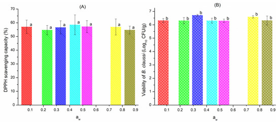 Figure 6B shows the viability of B. claussi microorganisms at the different aw. The variation in viability was narrow, showing values between 6.3–6.7 Log10 CFU/g. In consequence, the ANOVA showed that the population means were not significantly different at the 0.05 level. This suggested that the blend MX-IN:25-75 was able to microencapsulate the microorganisms and keep them alive after the drying process and during storage at 35 °C under the different humidity conditions. On the other hand, the values found here were relatively lower than those reported in [10]. This can be explained in terms of the MX concentration, since MX favors the microencapsulation of the microorganism and its protecting effect is more pronounced than that of IN. This may be caused by the difficulty that microorganisms may have in metabolizing the long carbohydrate chains of IN [40]. Vázquez-Maldonado et al. compared IN and lactose as co-microencapsulating agents of resveratrol and B. claussi. They found that IN showed higher capacity for the conservation of resveratrol, while both materials showed similar viability values for encapsulating the microorganism [41]. Although the viability values reported herein were not very high, they were slightly above the minimum value recommended by the FAO/WHO (2003) to cause therapeutic benefits in humans. Therefore, the tested blend MX-IN:25-75 can be considered as functional food with probiotic properties.