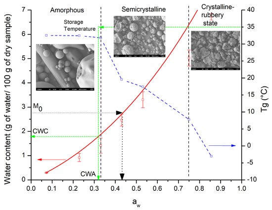 Figure 7 shows the equilibrium state diagram constructed for the functional food blend MX-IN:25-75 from the results of the physicochemical characterization. One of the main features in the state diagram is the moisture adsorption isotherm at 35 °C (the red solid curve). Here is indicated the water content at the monolayer level (M0 of 2.79 g of water per 100 g of dry sample), corresponding to an aw of 0.43. Moisture values greater than those of the monolayer will produce microstructural changes that can affect the behavior of the powder material. Thomsen et al. [45] constructed a state diagram for amorphous lactose to set the storage temperature and water activity at which lactose may remain in the glassy state. The depicted isotherm at 25 °C was employed as the borderline for separating the storage conditions for stable from unstable amorphous lactose. Fabra et al. [46] employed the concepts of aw, Tg, and the critical water content (CWC) to set the storage conditions of grapefruit. Because of the high water content of the fruit, it must be stored at freezing temperatures.