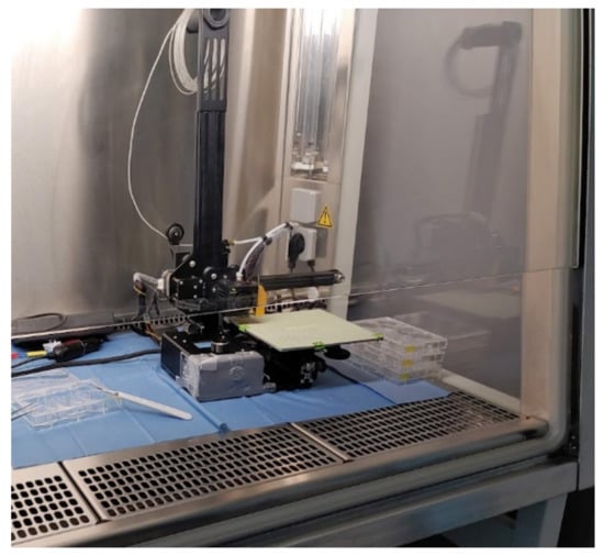 First, a clean and sterile environment had to be ensured. Inside a workbench with a hood and continuous airflow (Safe 2020, Thermo Fisher Scientific Inc., Schwerte, Germany), a smaller 3D printer (modified Ender-2, Creality 3D, Shenzhen, China), which shares the same extruder and print head as the Ender 3, was used. The heated bed surface was exchanged for a glass-reinforced epoxy laminate (FR-4) build plate, for easier disinfection. After covering the electronics, the whole printer was first precleaned with a 96%vol alcoholic solution and then placed under the hood of the workbench. Afterward, the printer was exposed to UV light for 30 min to ensure a germ-free printing environment. Neither the filament nor the specimens were treated. After loading it into the printer, the test specimens were printed with two different printing settings. The first batch of test specimens (n = 10) was printed using the same settings as mentioned in Table 1, which experience has shown to be a good foundation and was used in previous manuscripts []. These will be described as “trial stage 1” from now on. For the comparison group, i.e., trial stage 2, a higher temperature and longer thermal contact time of the PLA in the print head were aimed for. Therefore, the extrusion temperature was set to higher values with the highest possible cooling fan speeds to compensate for the increased viscosity. To maximize the time in the print head, the printing speed was slowed down and the line width was reduced. The printing setup can be seen in Figure 3. The printed parts were then transferred with sterile forceps into a 6-well plate (Sarstedt, Nümbrecht, Germany) containing RPMI media. Afterward, they were stored for 7 days in an incubator at 37 °C and checked every day for indirect signs of contamination, like changes in color or transparency. As a positive control, non-printed and non-treated filament were incubated with the same protocol.