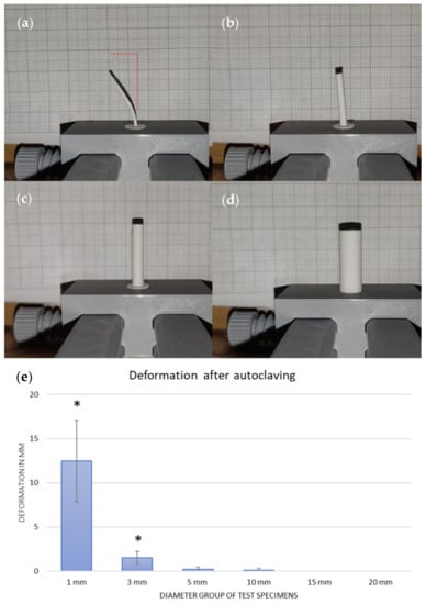The reduction of the deviation with ascending diameter of the specimen can be seen. The specimens are rotated to their maximum degree of deviation, starting with 1 mm (a), 3 mm (b), 5 mm (c), and 10 mm (d). (e) A diagram which shows the resulting biggest deformation of one axis of the test specimen in mm and the related SD. After autoclaving, the groups with diameters ranging from 1 to 3 mm showed significant deformation (shown by “*”).