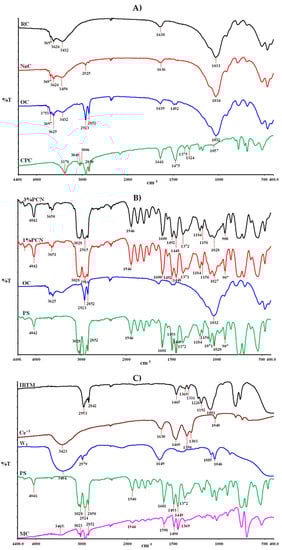 FT-IR of (A) RC, NaC, OC and CPC, (B) OC, PS, 1% PCN and 3% PCN, and (C) PS, Ce+3, IBTMS, and MC.