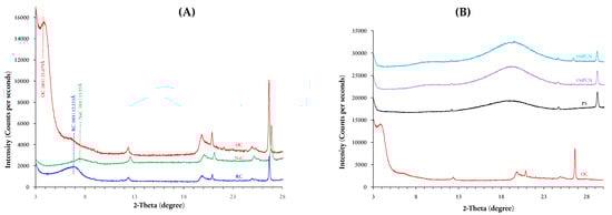 As presented in Figure 1A, the FT-IR spectrum of RC, NaC and OC clearly shows the same characteristic bands. However, the OC shows the characteristic bands of CPC, which indicates the success of the modification process and the transformation of the inorganic NaC into an organic moiety [,,,,,].