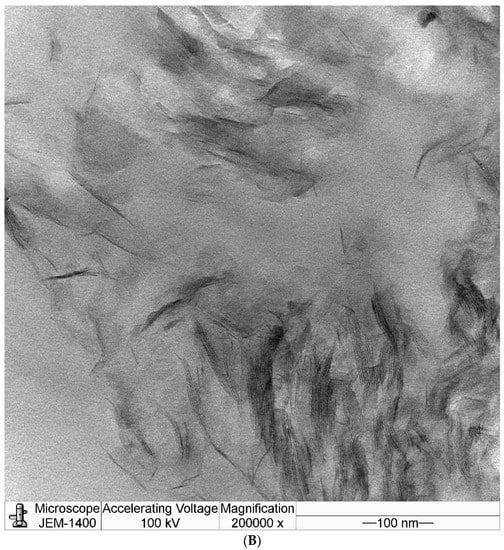This technique (TEM) is powerful due to its effectiveness in determining the internal structure of the nanocomposites in the nanoscale range. Thus, the degree of the clay nanolayer exfoliation in polystyrene can be verified. To support the results revealed by FT-IR and XRD, transmission electron microscopy (TEM) analysis was performed on the prepared 1 wt.% and 3 wt.% PCN. The light areas correspond to the polystyrene, while the hair-like dark areas are related to the nanolayers of the clay [,]. Both 1% PCN and 3% PCN were imaged at ascending magnifications (100,000 and 200,000). In Figure 4A, the TEM images of 1% PCN are presented. As shown, the clay layers are lined with each other in most areas, maintaining a generally parallel arrangement, indicating the presence of an intercalated structure, while the hair-like areas in the samples provide an exfoliated structure [,]. As shown in Figure 4B, free 3% PCN clearly shows that the nanolayers have been totally dispersed throughout the polystyrene matrix. Therefore, combining the XRD and TEM results, it can be observed that the free 3% PCN has an exfoliated structure [,]. This result can be strongly observed in the 200,000 magnifications. It is worth noting that the black areas belong to the clay layers that were not dispersed in the polystyrene matrix.