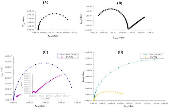 EIS Nyquist plots of (A) Bare C-steel, (B) PS, (C) 1 wt.% PCNs free and impregnated, and (D) 3 wt.% PCNs free and impregnated after 1 h of immersion in 3.5 wt.% NaCl at 20 ± 0.5 °C.