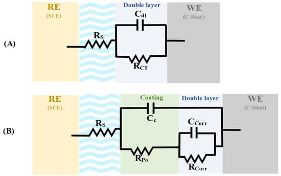 During the coating preparation processes, many defects such as micropores, cavities, as well as free volumes are generated in the coating, resulting in penetration of the coating by corrosive electrolytes, causing a reduction in the barrier performance of coating with time [,,]. For the organic coating of metals, the usual interpretation of the impedance diagrams in the high-frequency (HF) part is related to the organic coating, while the low-frequency (LF) part corresponds to the reactions occurring on the metal through defects and pores in the coating [,]. In this study, we focus on the Nyquist plots to build our interpretation of EIS data based on their fitted (calculated) data via a suitable equivalent circuit. Two equivalent circuits were used, depending on the corroding system. For the bare C-steel electrode, the simplest circuit known as (Randles) was applied. However, the coated electrode has additional components to compensate for the mechanisms or processes when the coating becomes deformed or penetrated. One of the most effective applications of the EIS has been on the evaluation of the anticorrosive coating’s efficiency and its changes during exposure to corrosive environments. From the Nyquist plot in Figure 5A, we notice only a single semi-circle for the bare C-steel, whereas the Nyquist plots related to the PS-coated samples in Figure 5B and for PCNs free samples in Figure 5C consist of almost two semi-circles. The PCN (MC) in Figure 5B,C show a semi-circle with a larger diameter than the PCN coating, which reflects higher Rcorr values and higher protection.