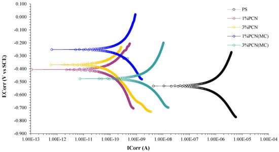 Tafel plots of PS, 1% PCN, 3% PCN, 1% PCN (MC) and 3% PCN (MC) after 1 h of immersion in 3.5 wt.% NaCl at room temperature 20 ± 0.5 °C.
