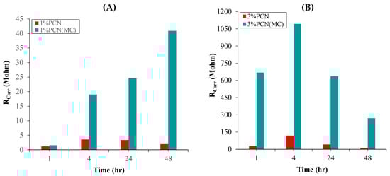 Corrosion resistance RCorr (MΩ) vs. time at 1, 4, 24 and 48 h for (A) Free and impregnated 1%PCNs, and (B) Free and impregnated 3%PCNs immersed in 3.5 wt.% NaCl at room temperature 20 ± 0.5 °C.