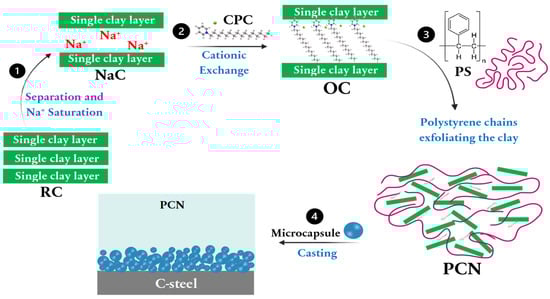 In the case of the new PCN coating impregnated with MCs, the suspended MCs in isopropyl alcohol were distributed on the surface of the C-steel rod and then left under atmospheric air for about 10 min until the alcohol evaporated. Next, the casting of the PCN solution was done following the procedure described previously. Finally, before performing electrochemical measurements, the thickness of the dry-casted coating on the electrode was determined using Elcometer 456 coating thickness gauge, and it was noted that the total thickness was in the range of 100 ± 15 µm. The synthesis of polystyrene–organoclay nanocomposite and the coating of the C-steel is depicted in Scheme 1.