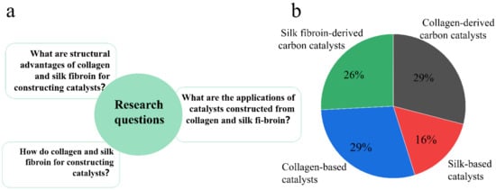 This review aims to introduce the latest progress in the field of collagen- and silk fibroin-based catalysts. It also provides a summary of past years of research in this field. At the beginning of the review, we define the following research questions (Figure 1a). To guarantee the completeness and accuracy of this review, the search strings used allowed for correct coverage of the addressed topics. The literature search was conducted with the specific keywords ‘collagen’, ‘silk fibroin’, ‘catalysis’, ‘carrier’, ‘carbonization’ and combinations of the latter, using advanced search in the databases. The following databases were used: