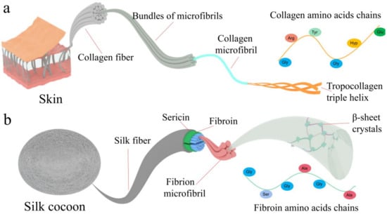 Hierarchical structures of collagen and silk fibroin. (a) Schematic diagram of skin, collagen fiber, triple helix, and molecular structure. (b) Schematic diagram of cocoon, silk fiber, sheet, fibroin, and molecular structure.