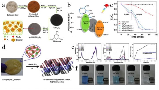 - Telay Mekonnen, B.; Meiyazhagan, A.; Ragothaman, M.; Kalirajan, C.; Palanisamy, T. Bi-Functional Iron Embedded Carbon Nanostructures from Collagen Waste for Photocatalysis and Li-ion Battery Applications: A Waste to Wealth Approach. J. Clean. Prod. 2019, 210, 190–199. [Google Scholar] [CrossRef]