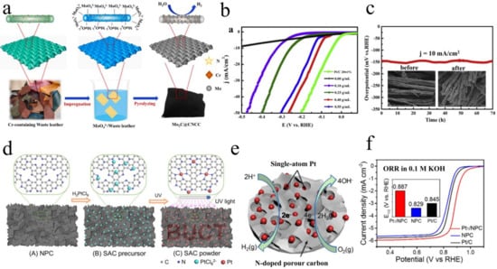 Animal skin is a 3D network of collagen fibers with excellent elasticity and tension. For example, in pig skin, the collagen fibers and fiber bundles are mainly arranged in two directions, passing roughly obliquely between the epidermis and subcutis. This unique protein network structure provides a multi-level carbon skeleton for the catalyst. Zhao created a new graphitic carbon nitride (g−C3N4)/C/Fe2O3 photocatalyst using waste leather as a raw material (Figure 6a) []. Because C/Fe2O3 and g−C3N4 produce an indirect z-type heterojunction that increases the carrier separation efficiency, Cr(VI) can be decreased by up to 99.9% in 40 min (Figure 6c). Kuntal Chatterjee [] reported a facile synthetic technique to convert goat skin waste into N-rich graphitic carbon materials with a nano-onion structure for a metal-free ORR catalyst. The main driving force for the ORR activity was the presence of pyridine N atoms, which, in addition to providing a net positive charge to neighboring carbon atoms, also served as active sites, facilitating oxygen adsorption and electron attraction at the anode. Good electrocatalytic performance was shown for the ORR in an alkaline medium. Compared with standard Pt/C catalysts, this catalyst exhibited superior long-term durability and higher methanol crossover performance. In 2019, Berhanu Telay Mekonnen [] uniformly mixed FeCl3 solution with collagen from a waste leather solution and lyophilized it to obtain a FeCl3 collagen scaffold. Finally, the scaffold was carbonized at 1000 °C for 2 h to obtain Fe@C nanoparticles (Figure 6d). The synthesized Fe@C nanoparticles were spherical core–shell nanostructures with ferromagnetism at room temperature. They exhibited a 100% degradation rate for methylene blue under sunlight, and the catalyst recovery was simple (Figure 6e,f). Recently, Qiaoling Kang [] soaked leather in (NH4)6Mo7O24⋅4H2O aqueous solution and calcined at high temperature to synthesize molybdenum carbide (Cr, N) co-doped carbon cloth (Mo2@CNCC) (Figure 7a). Mo2C nanoparticles were coupled and uniformly distributed in waste leather-derived carbon fibers, which was beneficial to the electrocatalytic performance. The Mo2C@CNCC catalyst was different from other MO2C HER electrocatalysts that require acidic media, and it exhibited excellent catalytic activity for HER in alkaline media (Figure 7b,c). With Mo2C@CNCC under the voltage of 2.0 V, the Faraday efficiency of the two-electrode device was close to 100%, and the volume ratio of H2 to O2 was 2.05:1. Furthermore, the Mo2C@CNCC catalyst was simple to utilize and could be directly employed as the working electrode.