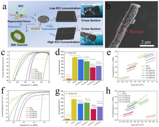 - He, H.; Zhang, Y.; Zhang, W.; Li, Y.; Zhu, X.; Wang, P.; Hu, D. Porous Carbon Nanofibers Derived from Silk Fibroin through Electrospinning as N-Doped Metal-Free Catalysts for Hydrogen Evolution Reaction in Acidic and Alkaline Solutions. ACS Appl. Mater. Interfaces 2022, 14, 834–849. [Google Scholar] [CrossRef]