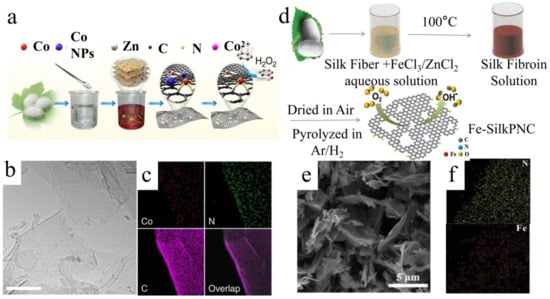 (a) Preparation process of a Co-ISA/CNS catalyst [], (b) TEM image of Co−ISA/CNS, (c) EDX elemental mapping of CoISA/CNS. Reprinted from Ref [] Copyright (2018) with permission from Springer Nature. (d) The reparation process of Fe-SilkPNC, (e) TEM image of Fe-SilkPNC, (f) EDX elemental mapping of Fe-Nx-C. Reprinted from Ref. [] Copyright (2019) with permission from Wiley.