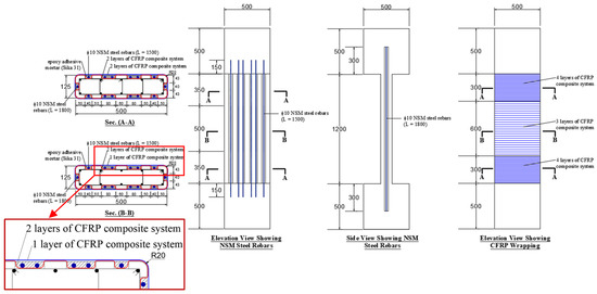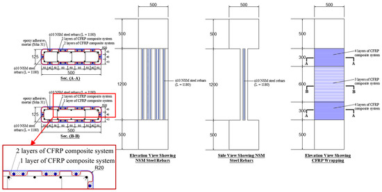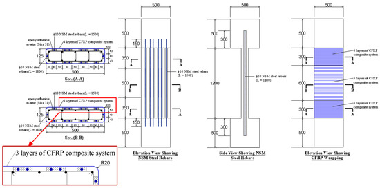 The third scheme of strengthening wall-like columns is the same as scheme-2 except that the arrangement of the CFRP layers was different. The details of scheme-3 are shown in Figure 4. In this scheme, two of the CFRP layers were bonded to the column surface before the installation of NSM rebars, and these layers were bent inside the NSM grooves, as seen in Figure 4. However, the remaining CFRP layers were bonded to the column surface after the installation of the NSM rebars and filling out the NSM grooves with epoxy adhesive mortar (see Figure 4).