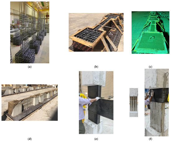 Figure 6 shows the different steps followed in the preparation of test specimens. The rebar cages of the wall-like columns are illustrated in Figure 6a. Figure 6b,c depict the wall-like columns before and after casting. All specimens were cast simultaneously using ready-mix concrete to avoid variations in concrete batches. Figure 6d shows the test specimens after stripping of forms and curing. The control columns were tested, whereas the columns meant for strengthening were strengthened using the developed schemes, as explained in Section 2.2. It should be noted that in all strengthened specimens the corners were rounded with a radius of 20 mm to reduce the concentration of CFRP stresses at corners (see Figure 2, Figure 3, Figure 4 and Figure 5).