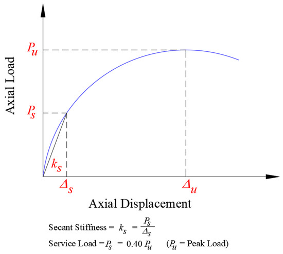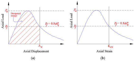 Table 3 depicts the key test results of the load-displacement response for test columns with regard to load and axial displacement at the onset of main rebar yielding, peak load, axial displacement at service load level, axial displacement at maximum load, axial displacement at the ultimate state level, stiffness at service load level, and dissipated energy. In the current research, the column stiffness (Ks) was computed as the ratio of service axial load (assumed as 40% of the maximum load [7,50,51]) to the related axial displacement (see Figure 9). As shown in Figure 10a, the energy dissipated (Eu) was assessed as the area under the load-displacement envelope up to ultimate displacement. The ultimate state was taken as that corresponding to concrete crushing, as presented in Figure 10b, and it is assumed as that corresponding to a failure load of where ϕ is the resistance factor for sections under concentric axial compression (= 0.65 as per both ACI 318-19 code [45] and SBC 304-18 code [46]). The reduction factor of 0.8 was taken as per the requirements of both ACI 318-19 and SBC 304-18 codes to account for the minimum eccentricity for tied columns. In this regard, it is assumed in this study that the column reaches its ultimate limit state if its load-carrying capacity is less than the design ultimate capacity calculated by the code.