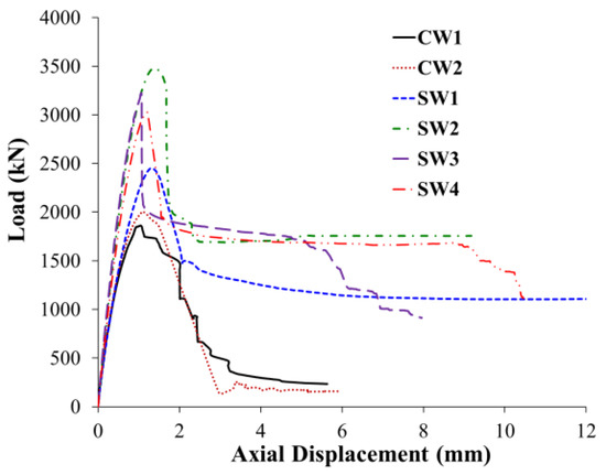 As outlined previously, this column was upgraded by 14 ф10 mm continuous NSM steel rebars in combination with the wrapping of three CFRP layers around the middle portion of the column. As seen from Figure 11 and Table 3, the enhancement in maximum load for this scheme was about 80% compared to the average peak load of control columns. The maximum load achieved for the strengthened column was 3478 kN, which is 42% higher than the load-carrying capacity of the column strengthened using the CFRP wrapping scheme (i.e., SW1). Thus, this strengthening scheme is quite efficient at enhancing the axial compression response of RC wall-like columns.