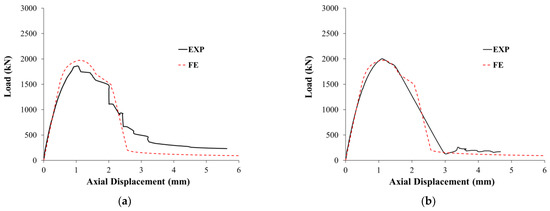 Experimental versus FE load-displacement curves for strengthened column SW2 are shown in Figure 20b. As noted, a good match was obtained between the experimental and FE load-displacement curves. The softening behavior was efficiently modeled, which proves the precision of the used constitutive models for concrete, steel rebars, and CFRP sheets. As seen in Table 3, this strengthening scheme was predicted to be very efficient at enhancing the ultimate load of wall-like columns. The FE peak axial load of the upgraded specimen SW2 showed increases of almost 87% and 45% over the unstrengthened column CW and the strengthened specimen SW1, respectively.
