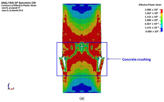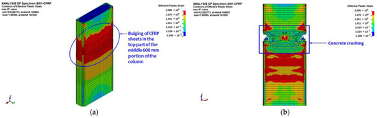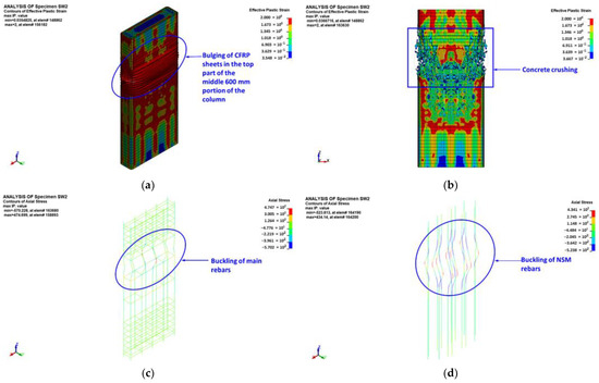 Figure 23 shows the numerically predicted failure modes for strengthened column SW2, in which the middle 600 mm portion was strengthened by a combination of three CFRP layers and 14 ф10 continuous NSM rebars. The predicted failure modes are presented in terms of X-stress contours (in the local coordinate system) for CFRP shell elements, effective plastic strain contours for concrete elements, and axial stress contours for beam elements of the reinforcement cage. As seen in Figure 23, the predicted failure modes matched well the test observations detailed in Section 3. The failure of specimen SW2 started by bulging of the CFRP layers in the top part of the middle 600 mm portion of the column. The bulging was concurrent with a rapid decrease in the axial capacity of the column. The ultimate failure was located in the top part of the middle 600 mm portion of the specimen, and it was owing to concrete crushing followed by a buckling of main and NSM steel rebars. With increased axial displacement, rupture of CFRP laminates occurred in the short side of the column section, as seen in Figure 23. This was evidenced by the predicted peak horizontal strain in the CFRP sheets listed in Table 4, as it was almost the same as the rupture strain of the CFRP composite system.
