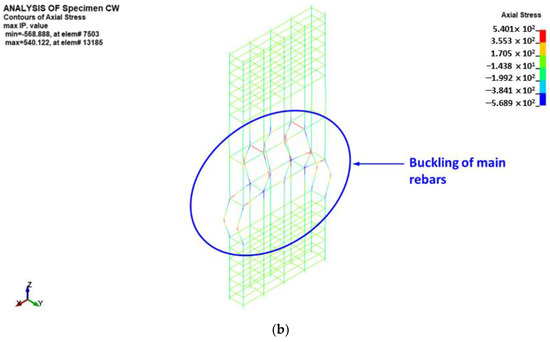 Figure 24 illustrates the predicted modes of failure for columns SW3 and SW4. As seen in Figure 24, the predicted failure modes agreed well with the experimental results shown earlier in Figure 13c,d. The failure of specimens SW3 and SW4 started with the bulging of the CFRP layers in the middle 600 mm length of the specimen (see Figure 24a). The bulging was concurrent with a sudden drop in the axial capacity of the specimen. The ultimate failure was located in the middle 600 mm portion of the specimen, and it was owing to concrete crushing (Figure 24b) followed by buckling of main and NSM steel rebars (Figure 24c,d). With increased axial displacement, rupture of CFRP laminates occurred in the short side of the column section (Figure 24e). This was confirmed from the predicted peak horizontal strain in the CFRP sheets listed in Table 4, as it was nearly the same as the rupture strain of the CFRP material.