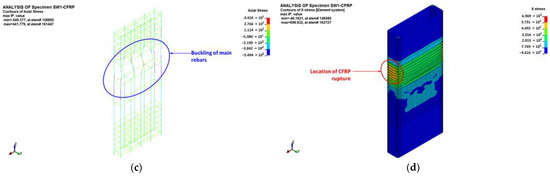 FE mode of failure for strengthened specimen SW1: (a) bulging of CFRP sheets at peak load; (b) effective plastic stress contours for concrete elements; (c) axial stress contours for rebar elements; and (d) X-stress contours for shell elements of CFRP sheets.
