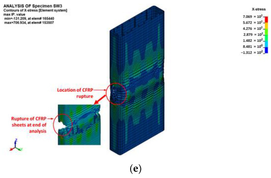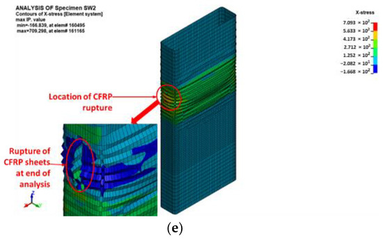 FE mode of failure for strengthened specimen SW2: (a) bulging of CFRP sheets at peak load; (b) effective plastic stress contours for concrete elements; (c) axial stress contours for main rebar elements; (d) axial stress contours for NSM rebar elements; and (e) X-stress contours for shell elements of CFRP sheets.